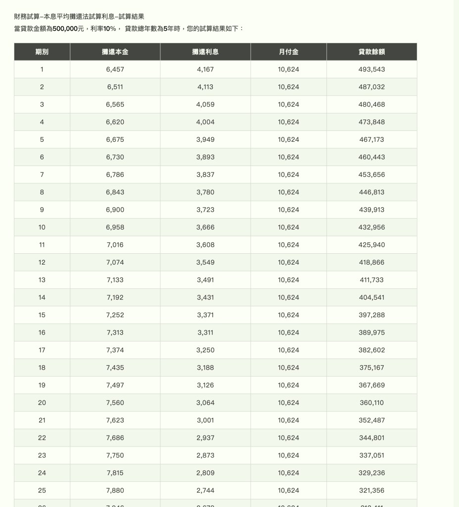 這個表就是在申請貸款時,銀行會提供給你的每期應繳金額明細,你可以看到表中列出不同期數中你所繳的本金、利息、本利加起來的金額,以及還剩下多少本金。如果銀行沒有給你這樣的表,你也可以利用網路上提供的試算工具自己來計算,連在放在影片下方的說明欄中。大家可以自己來計算看看。